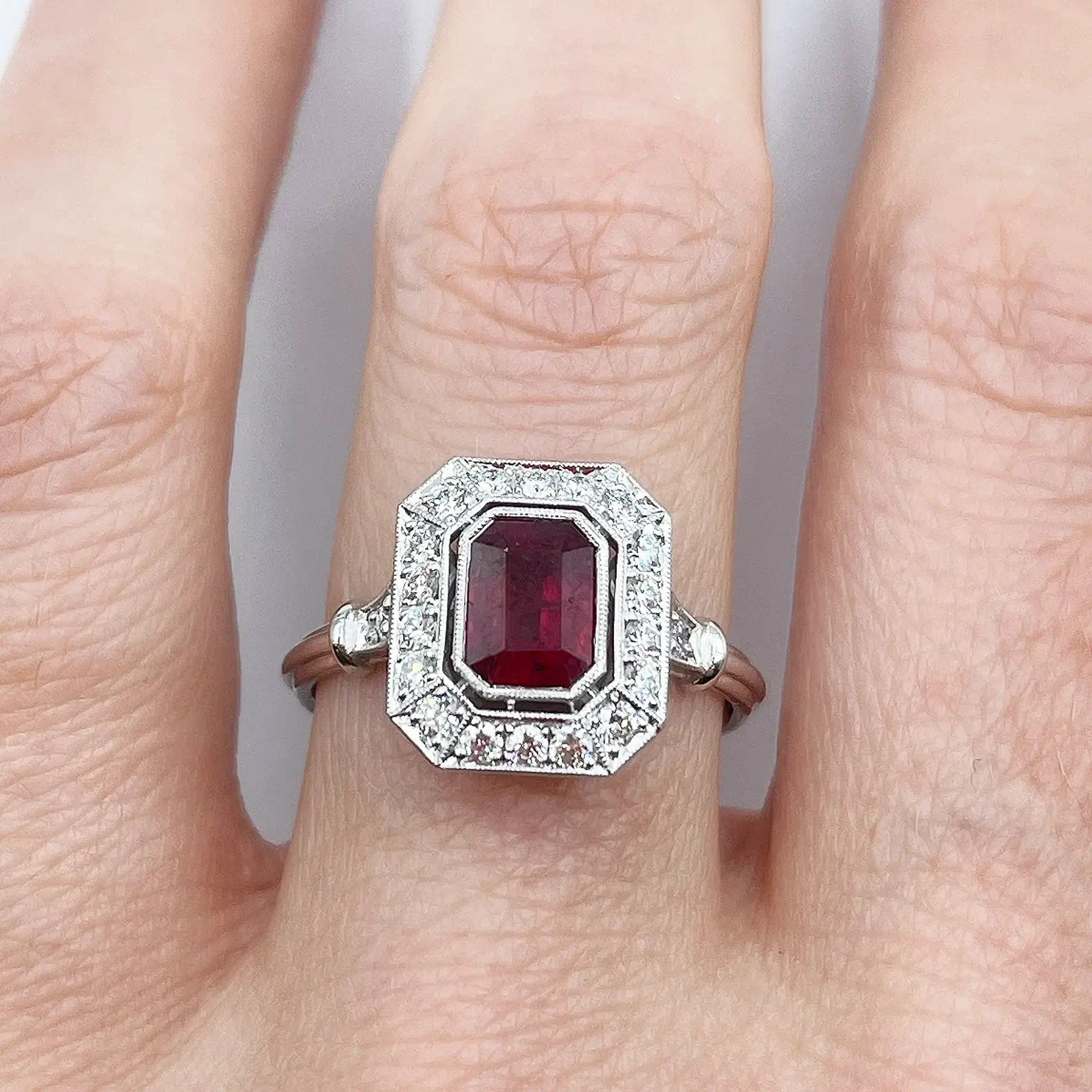 The Art Deco emerald cut ruby engagement ring delivers more than beauty. It expresses history, artistry, and emotion in one timeless piece. Crafted to last for generations, it makes the perfect heirloom for couples who value design and legacy.